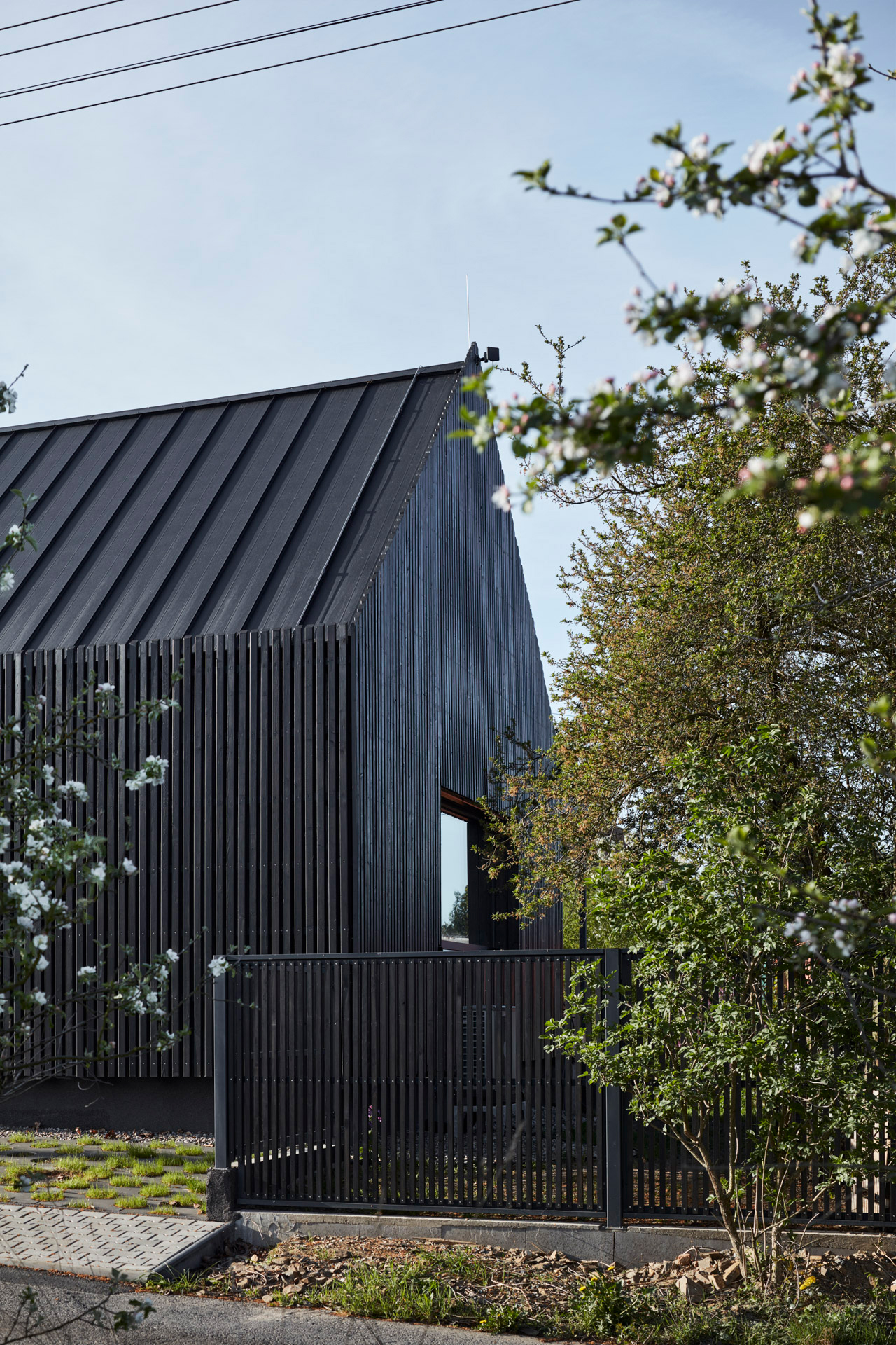 Dům je kombinací moderní čistoty s přírodními motivy a vytváří se svým okolím vizuálně ohromující celek. Důmyslně navržený exteriér, ozvláštněný černými latěmi a elegantními liniemi, tvoří nevšední komplex a skvěle komunikuje se zahradou i vodní plochou, která jí dominuje.